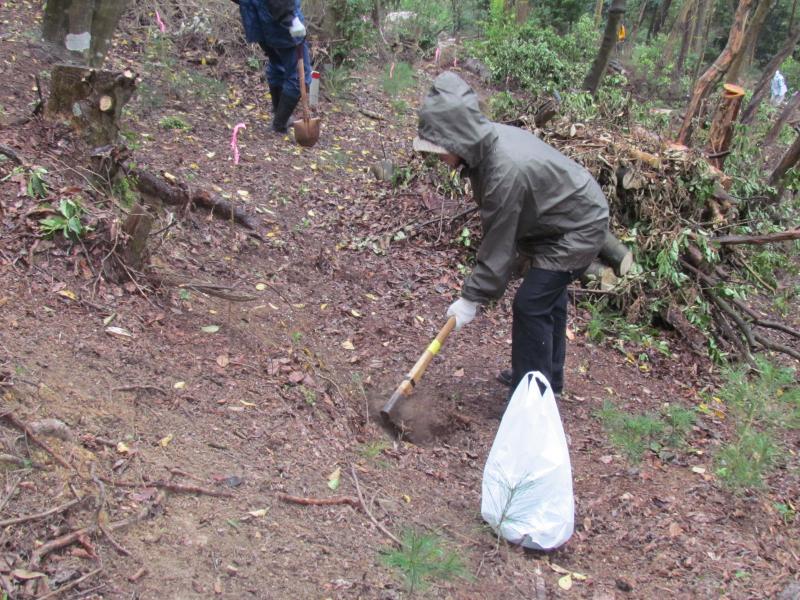 記念植樹の後は、マツのある景観の再生を目指す「古都のマツの緑復活プロジェクト」の一環として整備を行っている銀閣寺山国有林において、24名のトラック協会関係者、フィールドソサイエティー18名の参加により、長谷川氏(大文字保存会所属)のマツの植樹指導の受け、抵抗性マツ200本を植樹しました。小雨の中、カッパを着て不慣れな鍬での作業に悪戦苦闘しながらも無事に植付することができました。