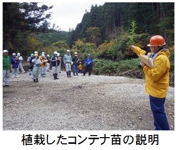 その後、更に移動して、複層伐箇所にて、国有林でのシカ捕獲事業、コンテナ苗の植付・獣害防護ネットの設置についての説明を行い、近畿中国森林管理局の石田企画官から「林業事業体の生産性向上」について、民有林での優良事例の紹介を行い、最後に現地での全体を通しての質疑応答を行いました。