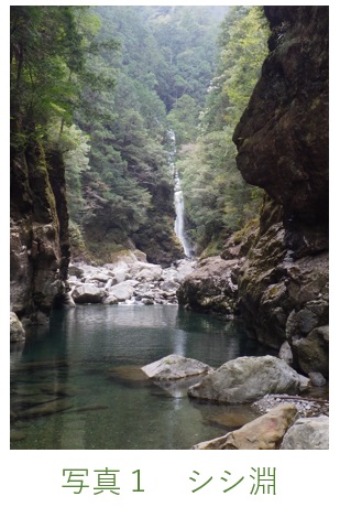 写真1は、大杉谷の見せ場の一つであるシシ淵の景色です。シシ淵は、岩の間からニコニコ滝を見ることができる絶景ポイントです。少し視線を上げるてみると、こちらに迫り来るように反り立っている岩壁が目に飛び込んできます。そして、その岩のわずかな隙間には、細いながらもたくましく、岩に張り付くように木々が成長していることが分かります(写真2)。