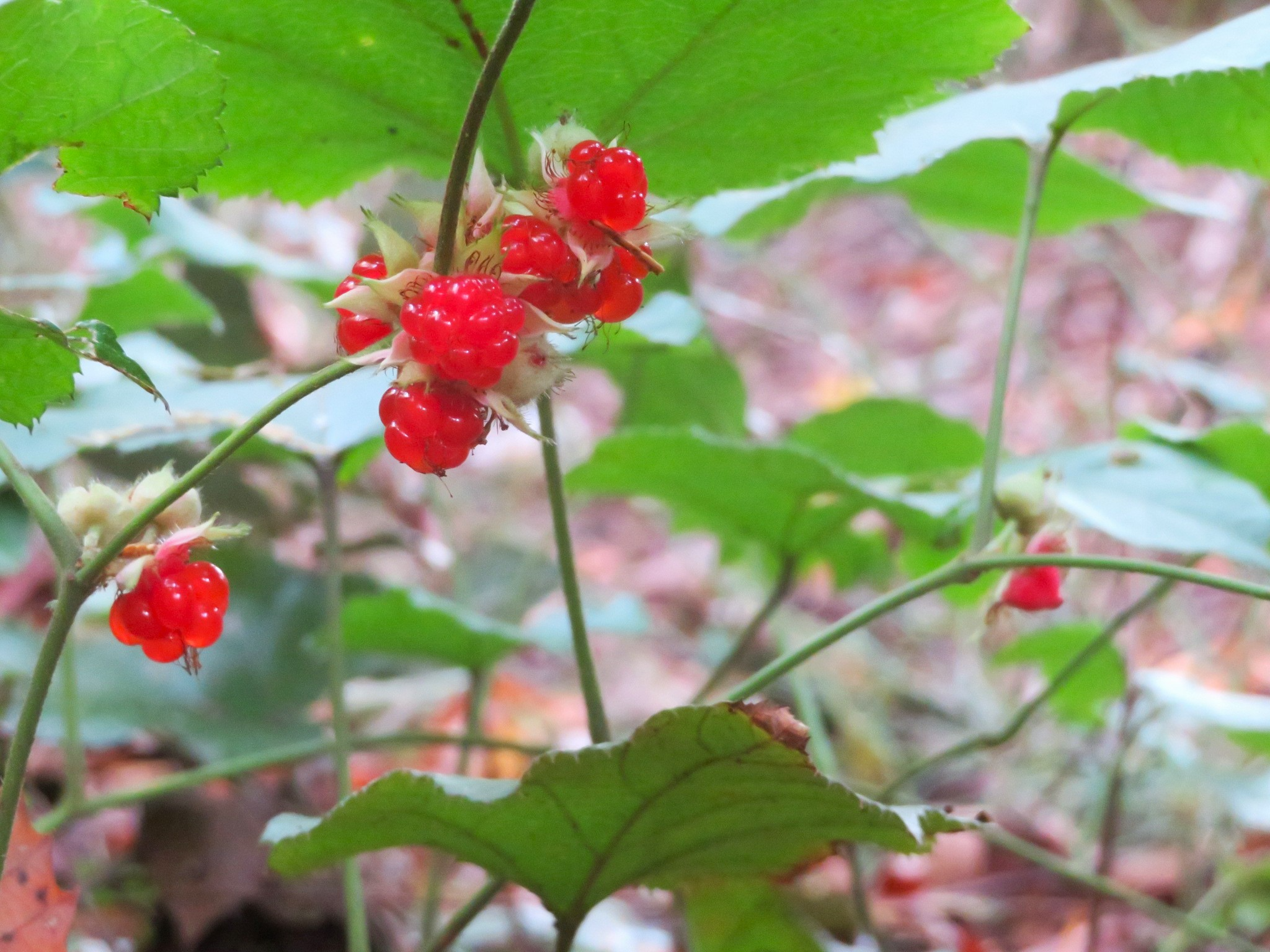 冬に大粒の赤いラズベリーのような実をつけます。キイチゴの仲間では珍しく冬に実をつける為、クリスマスチェリーという名で苗が売られていることも。
