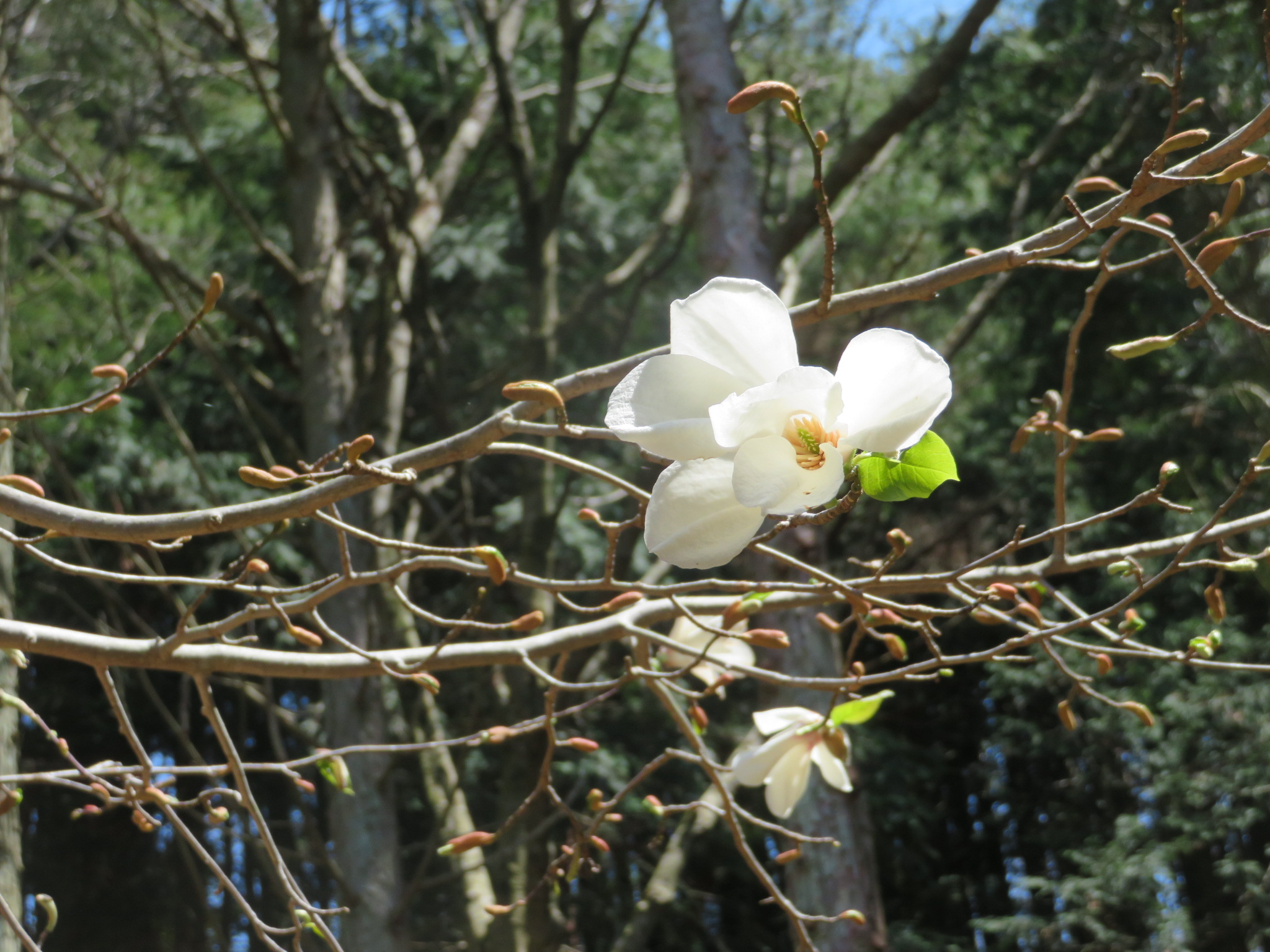 大きな白い花を枝先に咲かせるモクレン科の植物です。名前の由来はつぼみや果実の形が人の拳に似ていることからきています。