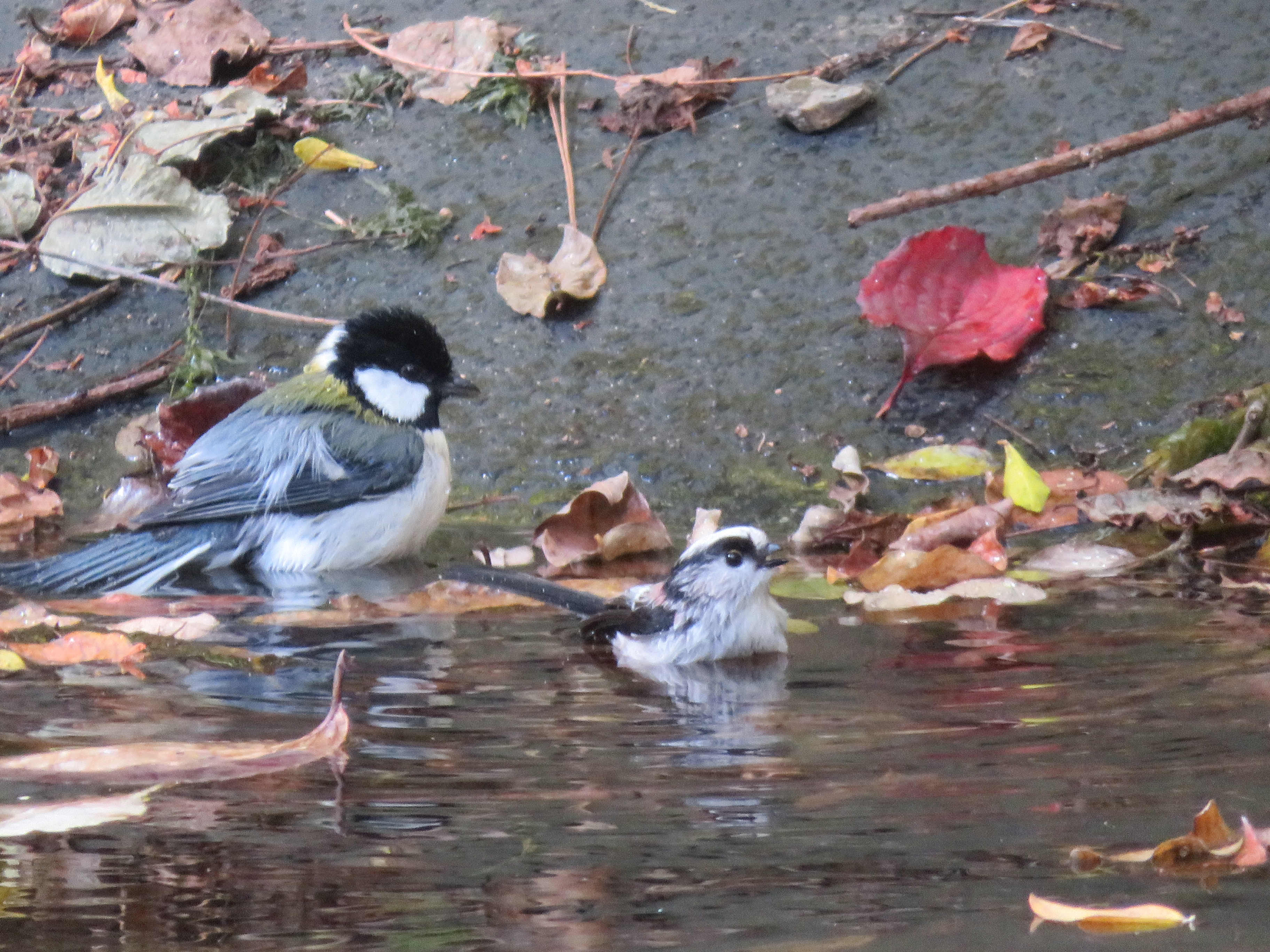 シジュウカラの水浴び中にかわいらしい乱入者(エナガ)が現れました。エナガの方が小さいですが、複数のエナガと協力してシジュウカラにお風呂場を引き渡すよう圧力をかけていました。お風呂場を横取りされたシジュウカラの表情が何とも言えません。