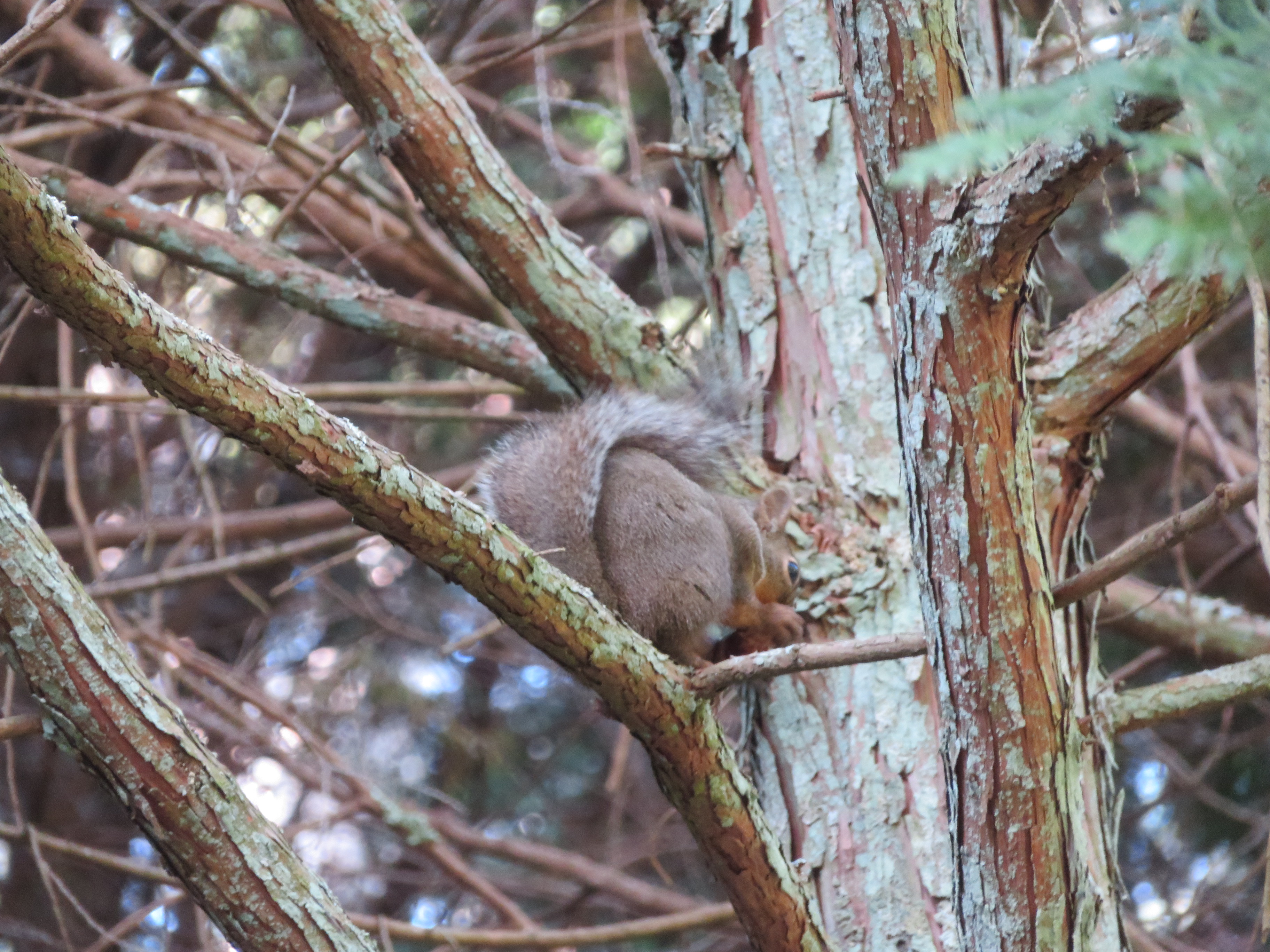 隣の松の木からとってきた松ぼっくりをお弁当のようにスギの木の上で食べていました。松ぼっくりは鱗片とよばれるうろこ状の部分の根元に種子があるため、リスは鱗片を1枚1枚はがして種子を食べます。鱗片をはがされた松ぼっくりはその見た目から森のエビフライと呼ばれています。