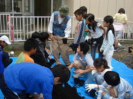 学校へ戻って、ポットに土を入れて、拾ったドングリを埋め込みました。先日作った5年生のポットの集団の横に、4年生のポットが増え、これからが楽しみです。 |