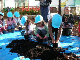 園児17名と職員の方で「オオクワガタの棲める森づくり」としてクヌギ、コナラのドングリの埋め込みをしていただきました。