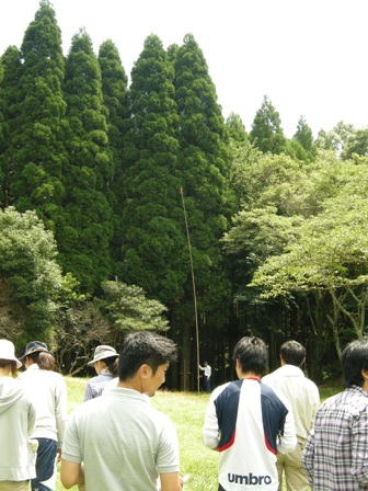 今回のセミナーの内容は、従来の京都教育大学の山下宏文教授による講義「森林環境教育の重要性と進め方」、箕面森林官による箕面国有林の概要説明、間伐体験に加え、当ふれあいセンターで作成した森林環境教育推奨事例集の中から、間伐に付随した事例として「木の高さを目測する」(左写真)、「木の年輪を数えよう」、「間伐、ナメコの植菌」を実践してもらいました。