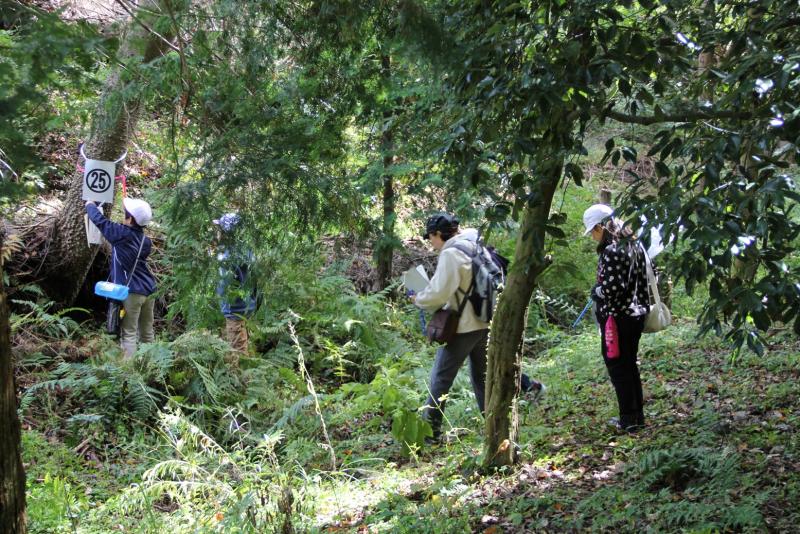 午前中は「森の探検隊」で、14組の5人班に分かれて引率する大阪森林インストラクター会と箕面森林官や局職員が付き添って探検を開始。ポイントは全部で34箇所あり、事前に決めてもらっていたポイントを順に巡っていきます。ポイントには、「指令書」と「ヒント」の封筒があり班全員でその指令書の答えを相談、その後に引率の大人からその答えや関連する情報を聞いて学習していきました。せっかちな子やのんびりした子がいて大変だったようでしたが、一様に楽しそうに森林を探検したようです。「楽しい-」「へー、そーなんだ。もっと森のことを知りたい」「こんな山の中に来たことがない」「でも、もっと自由に遊びたい」といった声も聞かれました。シカの被害やその対策などもポイントにして、少し難しかったかも知れませんが、記憶に残ったことかと思います。