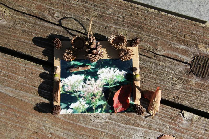 午後は「森と自然のフォトショット」で、デジカメで自分の気に入った動植物や風景など撮影し、選んだ写真をその場でプリントアウトして、台紙に貼りドングリや小枝、葉っぱなどで飾り付けて、自分だけのフォトフレームを作ってもらいました。少し時間が足りなくて思い通りの作品にするのが大変だったようでしたが、みんな個性のある作品に完成させて大事そうに持って帰りました。