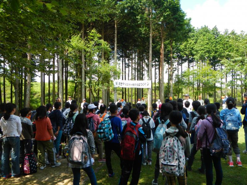 午前中は、「オオクワガタの棲める森づくり」箇所での林内散策と下刈り体験です。児童たちは6班に分かれて、植樹した苗木の生長、防鹿柵の様子、林内と林外の気温の差、伐採したあとの植生の移り変わりなどを、順繰りにリーダー役の局や京都大阪所の職員の説明を聞きながら見て回りました。植樹箇所では、3年前に自分たちで植えたクヌギやコナラが大きく育っているのを見て「あー、大きくなってる」と触って成長を確かめてみたり、記念標柱の前ではメッセージボードの文字を懐かしそうに見いっているこどもたちもいました。