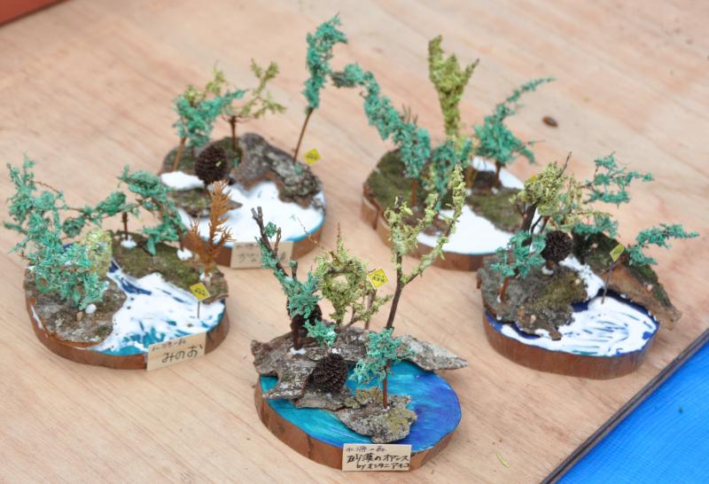 午後には時折青空も見える心地よい天気となり、管理棟前の広場で「水源の森ジオラマづくり」に取り組みました。まずはじめに水源かん養保安林の話をして森林の機能について知ってもらい、自分だけの水源の森をイメージするようにして作品の制作にとりかかりました。最初はこんなことして楽しいのという雰囲気でしたが、手順に従って作り始めると、友達同士で競い合いながらの楽しい笑い声や無口になって作成に没頭する人など、こどもも大人も楽しんでいただけたようです。