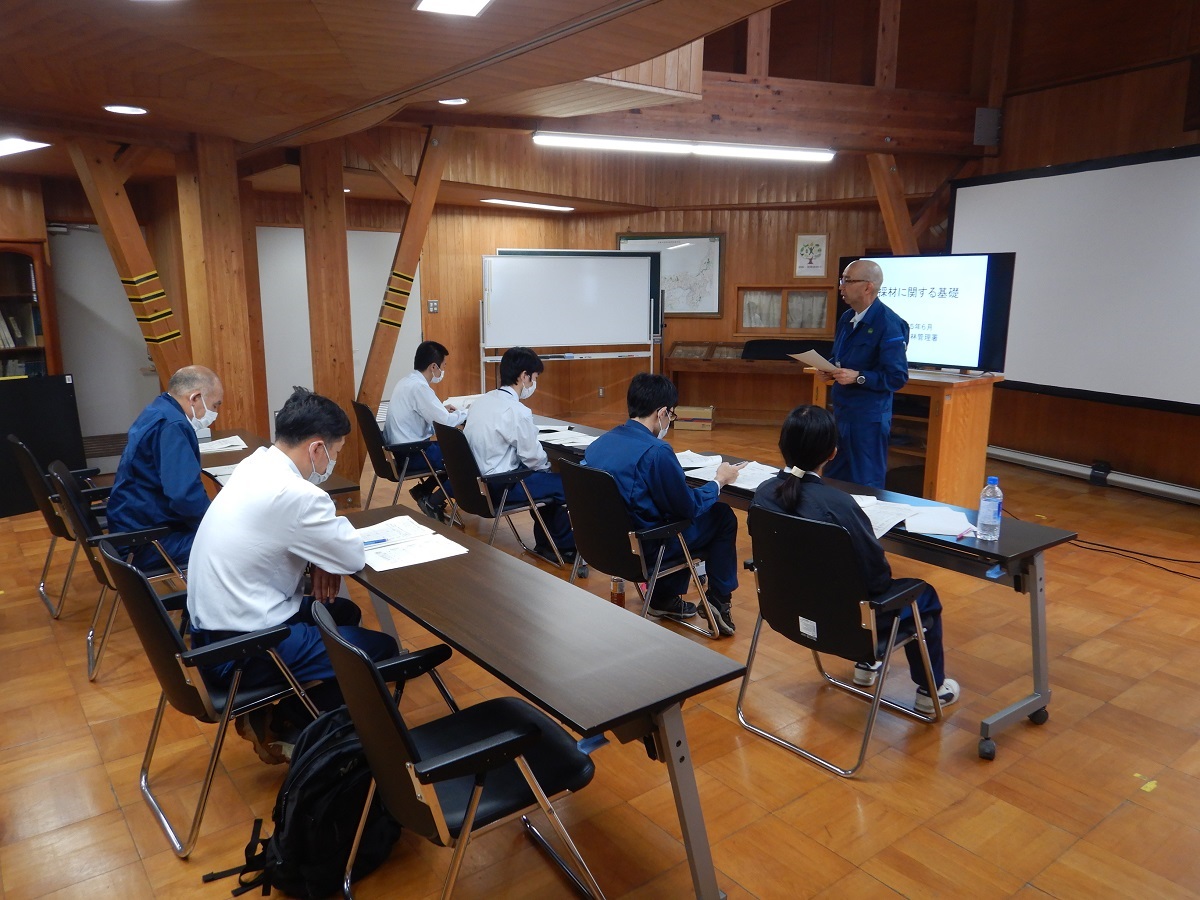現地での勉強会に先立ち岡山署の職員は、午前に森林技術・支援センター会議室にて、採材に関する基礎についての事前学習を行い、採材の勉強会に臨みました。