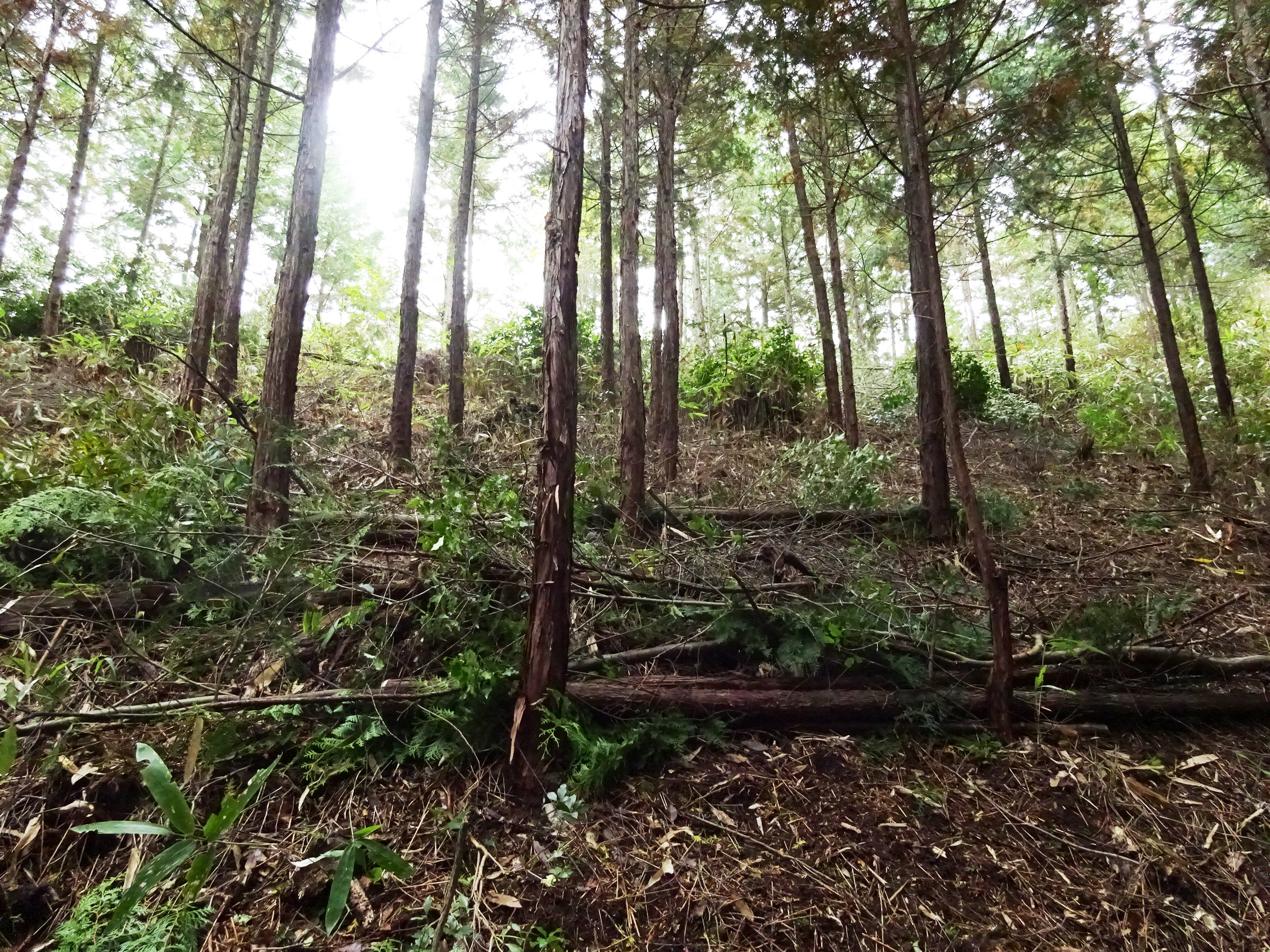 伐倒した木はある程度の長さにそろえて等高線方向に並べて整理しました。参加者には林業関係の方はいないとのことでしたが、作業の手際も良く曇天の下でも実感できるほど林内が明るくなりました。
