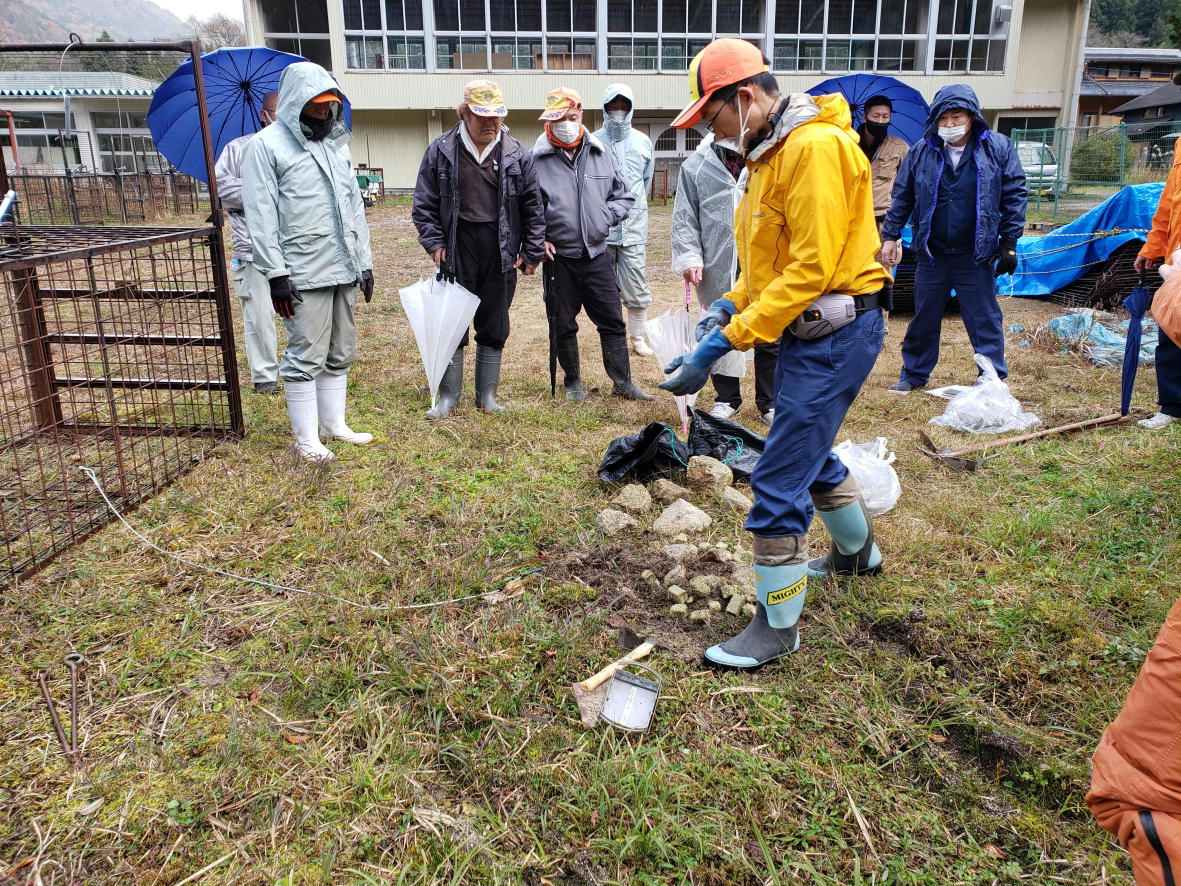 実演会には、米原市林務課及び滋賀県猟友会米原支部から総勢19名の参加がありました。午前に屋内で行われた講演では、近畿中国森林管理局保全課の渕上企画官と「小林式」の考案者である同課の小林保護係長から、ニホンジカの全国的な分布や森林被害の状況、ワナの種類とその特徴、「小林式」の開発経緯や具体的な実施手順及びこれまでの成果等について説明がありました。また、午後に屋外で行われた実演では、「小林式」によるくくりワナを実際に設置しつつ、設置時の留意点や設置場所の選定方法等について説明がありました。参加者からは「同じ場所に繰り返しワナを設置しても捕獲できるのが良い」「ワナの空はじきを防げそうだ」「早速試して成果があれば広めたい」などの感想をいただきました。