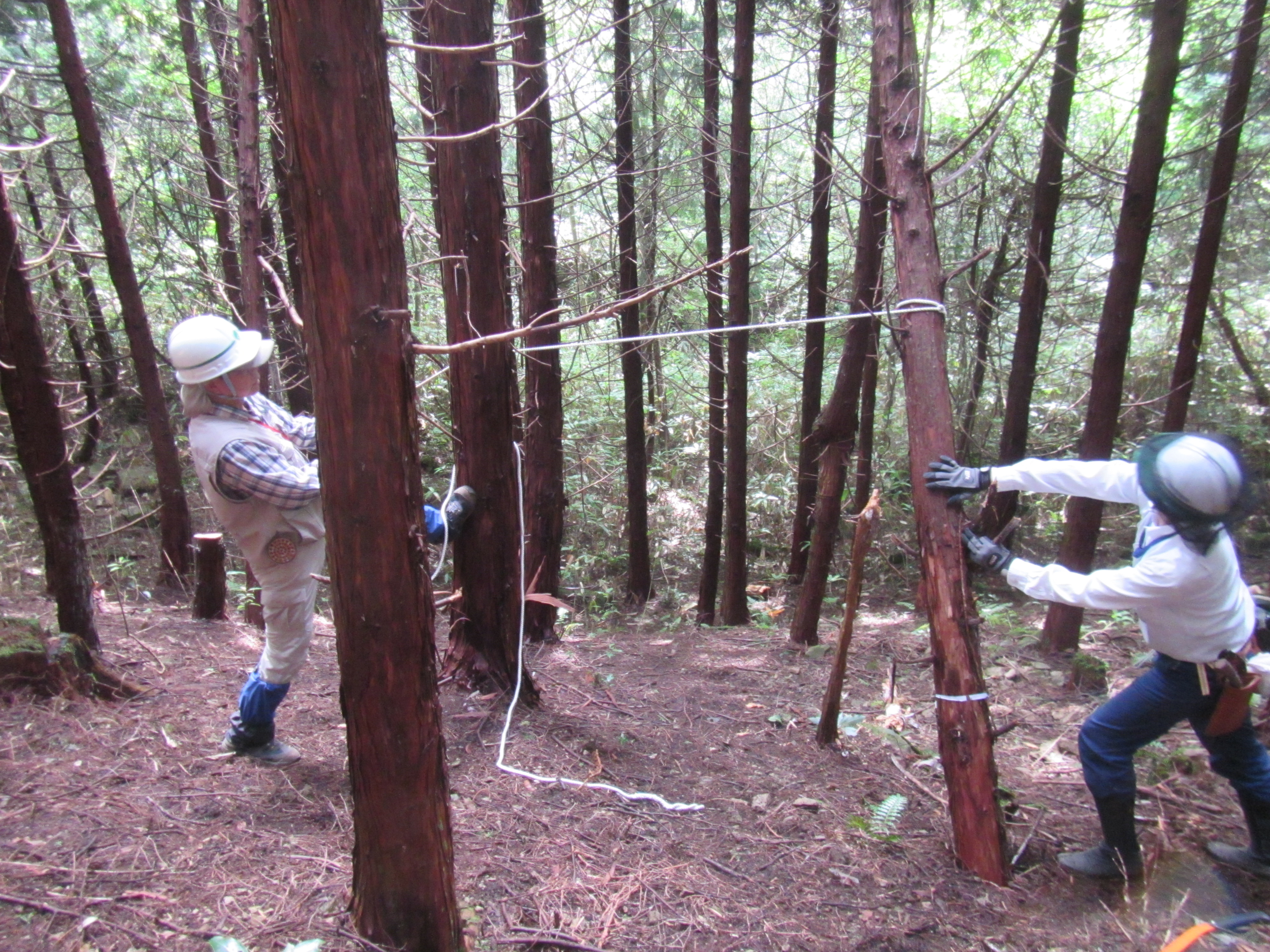 参加者で協力し合い、ロープを使って木を引っ張り、また、フェリングレバーで木を回しながら、なんとか倒すことができました。