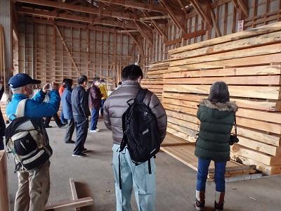 見学会では、山口中央森林組合の敷地内に保管されている滑マツ板材の状態を見学しました。