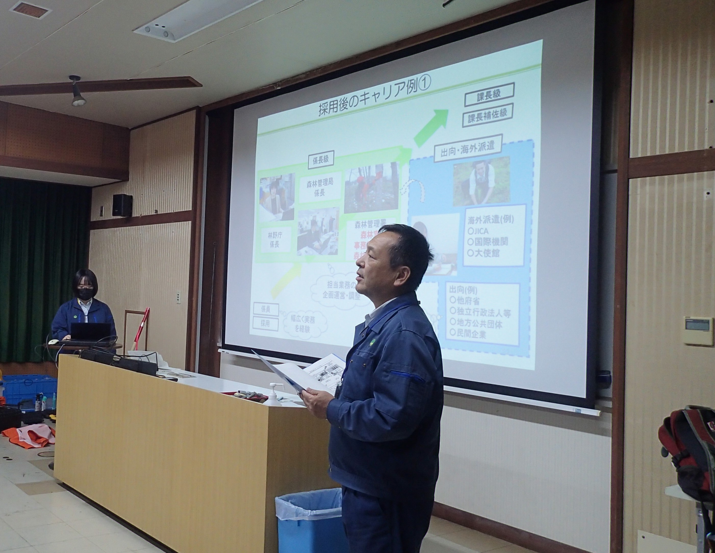 続いて、若手職員2名からこの職場を選んだ理由や仕事等について説明、生徒も真剣に聴き入っていました。