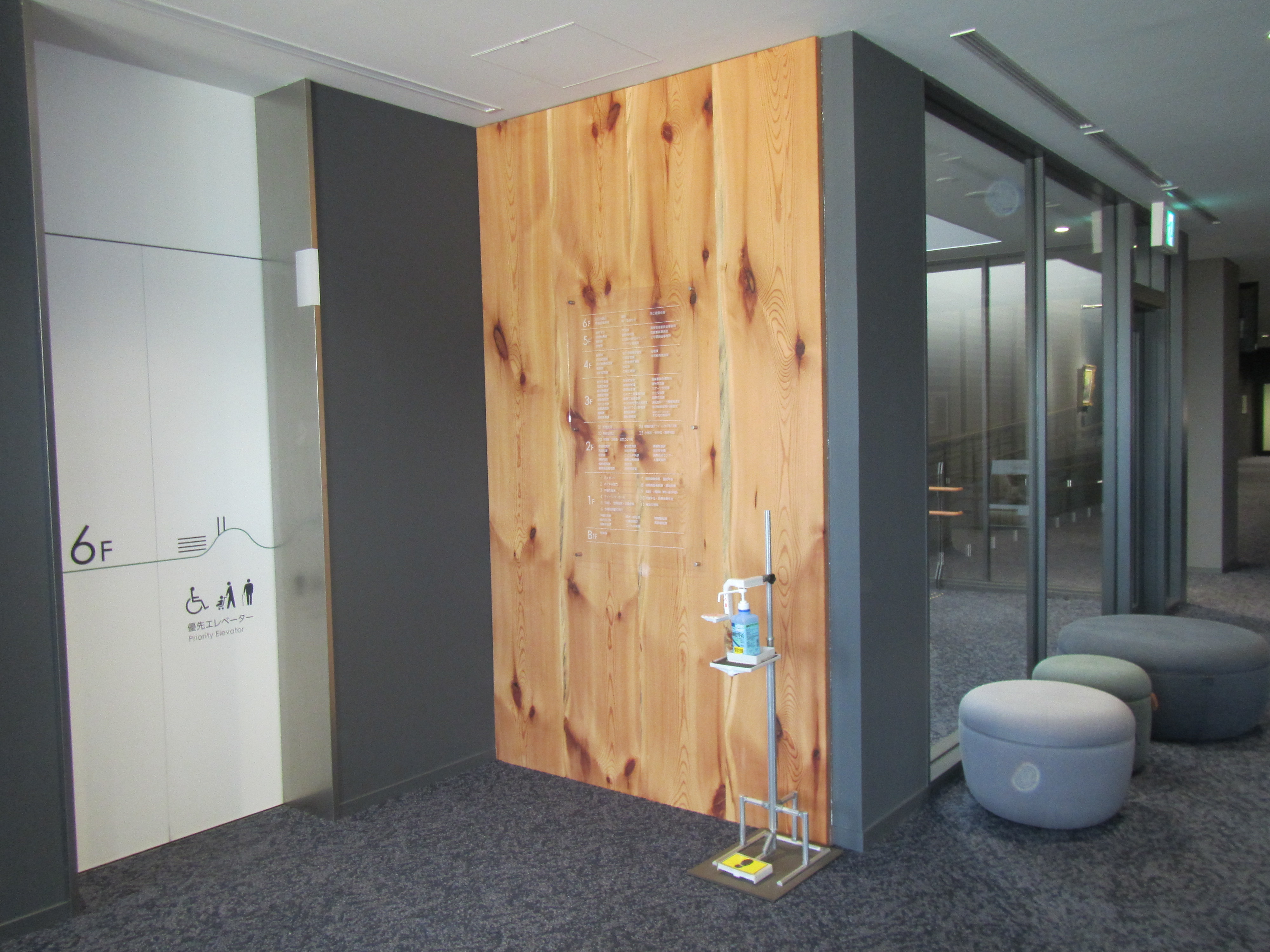 また、保護林として管理され市場にできることがなく、枯損木として山口市に売払いした滑マツを使用している山口市徳地総合支所の受付カウンターや講座室腰板を見学。その後、今年度完成した山口市本庁舎議場の演題後ろの衝立やエレベーター6階市民ロビーを見学しました。滑マツの大胆さや繊細さなど、特徴を生かした活用がされ、保存会メンバーから、滑マツのPRに大変役立っていると意見があり、保護と活用の両立が必要であると痛感しました。