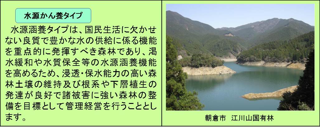 国有林の管理経営に当たっては、公益重視の管理経営を一層推進することとし、箇々の国有林を重視すべき機能に応じて「水源かん養タイプ」、「自然維持タイプ」、「森林空間利用タイプ」、「山地災害防止タイプ」、「快適環境形成タイプ」に区分し、公益林として適切な施業を推進しています。