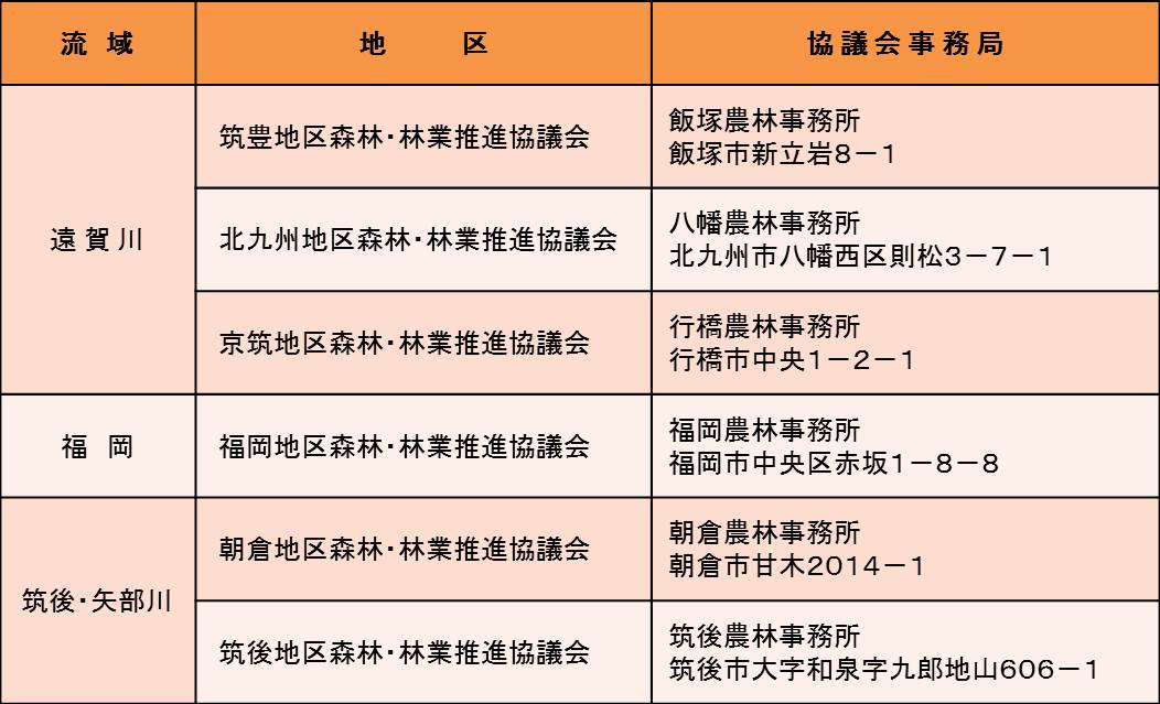 民有林行政、国有林行政が連携して流域の森林整備等を進めるため、福岡県の各農林事務所単位で設定されている地区森林・林業推進協議会に参画し、県の地方事務所、流域内の市町村をはじめ、川上から川下に至る多くの関係者と共に、森林・林業に関する諸施策の流域森林・林業の推進及び活性化の取組を進めます。