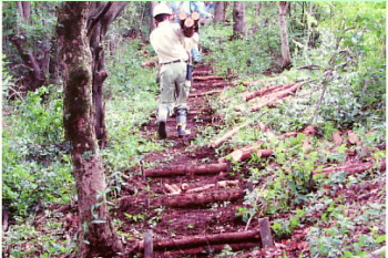 「大分水分ふれあいの森」で、大分グリーンヘルパーの会員17人が参加し、今年度3回目の森林づくりを実施。同ふれあいの森に「子供たちを招待したい」という意気込みで、間伐材を利用した階段づくりや歩道の整備を行いました。会員らは「道作りで山がきれいになった」と喜んでいました。今後は、会員らで歩道に面した樹木に名札を取り付けることとしています。