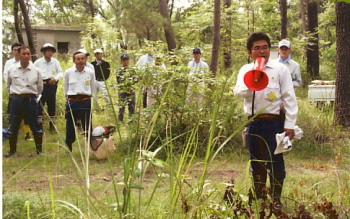 鹿児島県市来町の「遊々の森(青松の森)」において、市来町の町長はじめ職員、町議会議員と当署職員の72人が参加し、除伐作業に汗を流しました。これは、地域発案システムの一環として取り組んでいるもので、子供らが森林学習の場として利用しやすいように整備することが目的。今後は、町と連携しながら、歩道の整備や樹木名板を設置し、子供らの体験林業や植物観察の場として、また地域の憩いの場して活用できるよう整備することとしています。