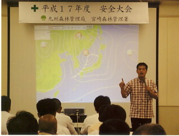 安全大会において、テレビ宮崎の「お天気おじさん」こと気象予報士の岩倉尚哉さんが講師となり、「気象情報の利用と地球環境」と題して講話しました。講話は、気象図の見方や気象予報の難しさ、昨今の異常気象など興味深い内容で、大変勉強になりました。また、岩倉さんは宮崎森づくりボランティア協議会の理事でもあり、「子供たちが森林とふれ合えるような場を作っていきたい」と抱負も述べられました。