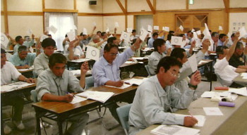 安全週間中、管内の請負事業体等を対象に安全会議を開催。会議には関係者約50人が参加し、各事業体等の安全活動の発表など行いました。また、会議のマンネリ化を防ぐため、小旗を使って回答する「○×クイズ方式」を採り入れるなど、講師と一体となった緊張感溢れる有意義な会議となりました。