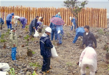 鹿児島県屋久町安房の国有林と町有林で、当署と屋久町、屋久島漁業協同組合、キリンビール株式会社が共催し、魚つき林植樹事業植樹祭を開きました。当日は約100人が参加し、抵抗性マツ、シャリンバイ、マルバニッケイの苗木250本を植樹。植栽地は岩石が多く客土しての植付で、参加者は悪戦苦闘していましたが、「豊かな森林が豊かな海を作る」など思い思いの願いを込めて植えました。今後も関係機関と協働し、魚つき林の再生に取り組むこととしています。