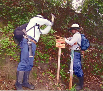 宮崎自然休養林内に、職員手作りの案内標識を設置しました。同休養林は、加江田渓谷の美しさや双石山・くんぱち山・花切山からの展望が素晴らしく、県内外から多くの登山者が訪れ、手作り標識は道案内と併せ、当署のPRにも役立っています。