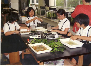 煮沸する間、児童らは葉っぱの付き方や葉の構造、水や養分を運ぶ「導管」などについて学びました。
