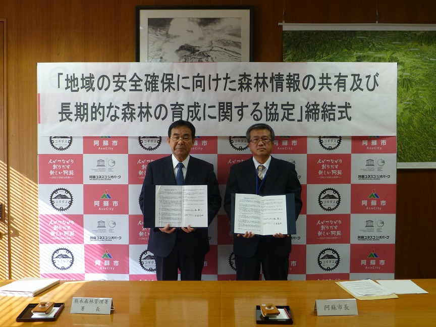 12月19日、阿蘇市役所応接室において、佐藤義興阿蘇市長と森勇二熊本森林管理署長との間で「地域の安全確保に向けた森林情報の共有及び長期的な森林の育成に関する協定」締結式が、阿蘇市役所や熊本森林管理署及び報道関係者ら10名が出席し実施されました。