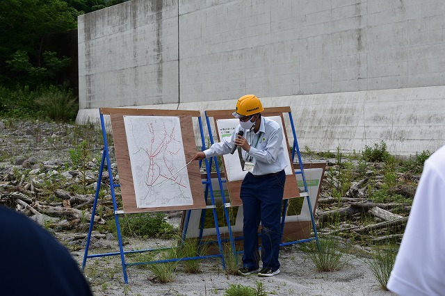 当日は、まず各地区の公民館にて村田孝彦署長の挨拶の後、眉山治山事業所の渕上翔吾治山技術官から、眉山治山の歴史や日頃は森林に覆われて市街地から見ることの出来ない場所に多くの治山施設が整備されている状況をドローンで撮影した動画を用いて分かり易く説明しました。