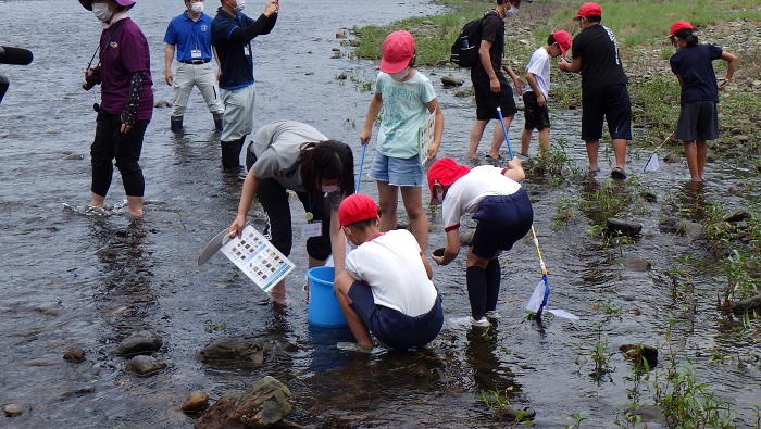 参加した児童は、河川敷で水辺調査や簡易水質調査、水生生物調査、ヤマメのつかみ取りを体験しました。日頃接触する機会の少ない水辺の自然環境に、見て、触って、考える、良い機会となりました。