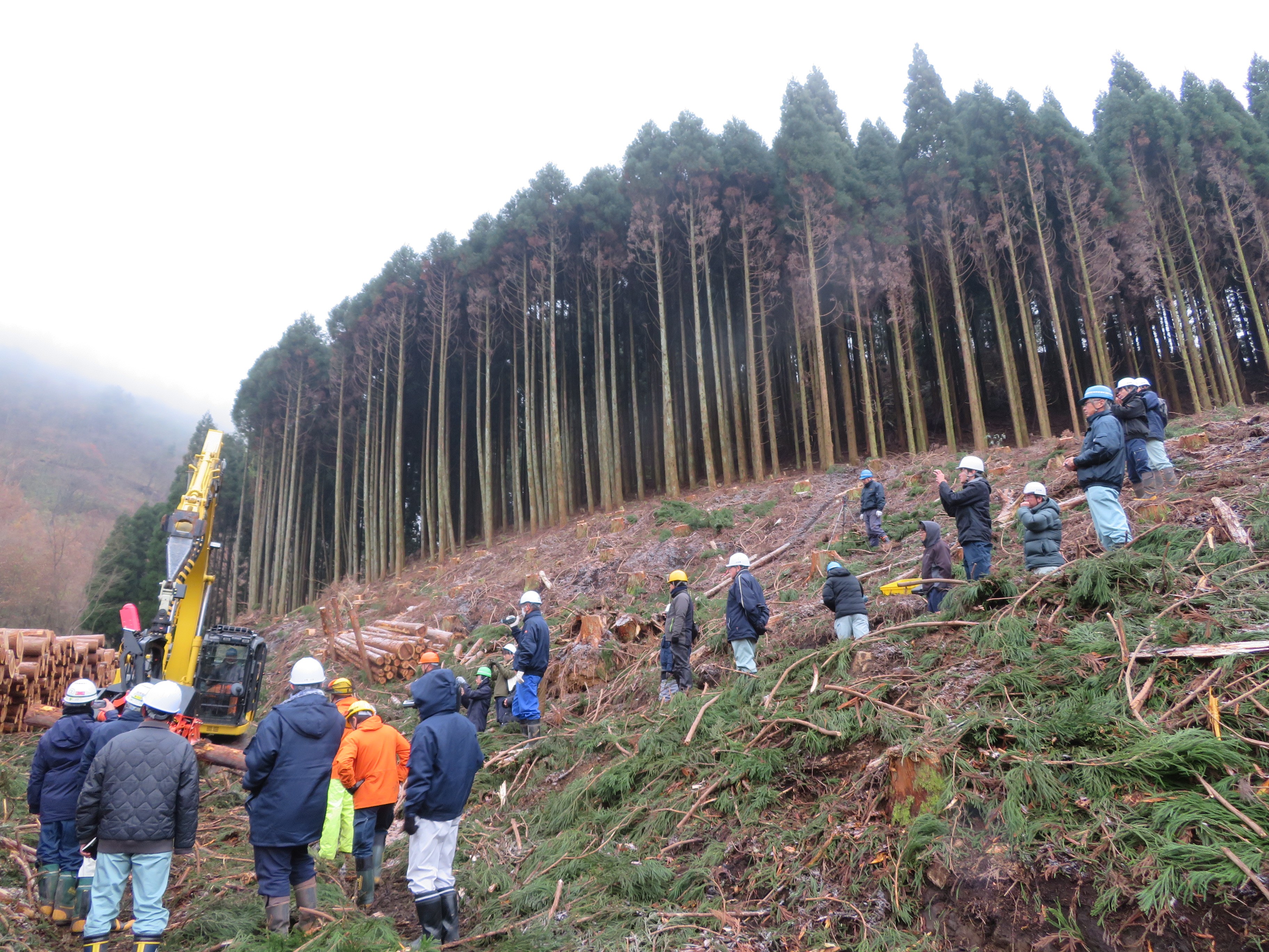 二日目は、玖珠町森平家山の森林整備事業誘導伐箇所にて、福山健一総括森林整備官等から、森林整備事業の説明を聞きながら、チェーンソーでの伐倒、高性能林業機械による伐倒や採材の作業状況を実際に目にして頂きました。