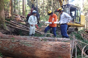 今回は、伐倒木それぞれについて、形状や品質から最適と思われる採材を時間を掛けて入念に検討しましたが、実際の作業では、丸太の切断は、アタッチメントにソーチェーンを取り付けた「プロセッサ」といった重機により行うことが多いことから、重機の操縦席から、また、短時間に適切な採材を検討して実行する必要があります。今後は、採材の検討をより効率的に行っていくため、オペレータが伐倒木の形状や品質を把握する技術の向上や、これを助ける機械の開発等について、素材生産者等と意見交換を進めていきたいと考えています。