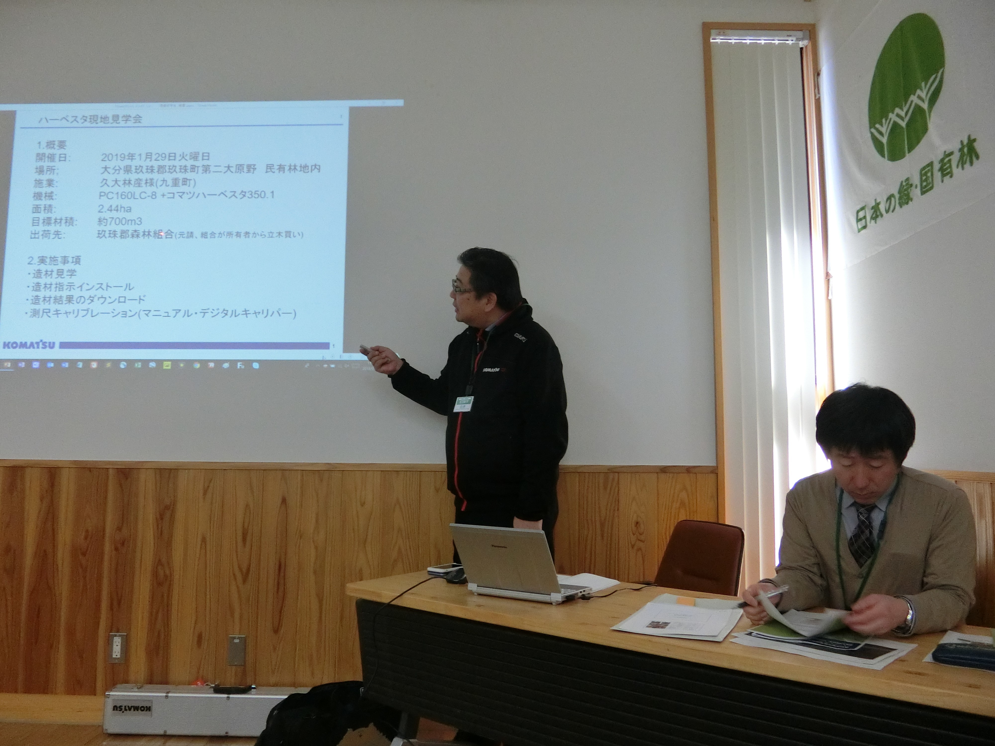 現地見学会に先立っては、当署会議室で、同機関代表の森林総合研究所林業工学領域伐採技術担当チーム長の上村巧氏から、同機関が研究開発を進めているハーベスタ等作業機で取得できる丸太の生産情報の有効活用の仕組みの構築への取組や、原木のヤング率、密度、曲がりを自動計測するハーベスタのプロトタイプが完成しつつあるといった開発状況等についての説明がありました。