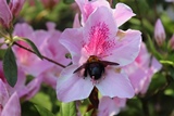 6~7部咲きのヒラドツツジ 赤色の花のヒラドツツジ 採蜜中のクロマルハナバチ 花の摺れたオンツツジ 石河内集落と小丸川