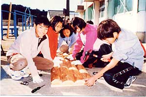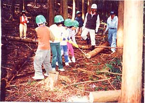 | 4 概 要 | 林業を取りまく状況が大変厳しい中で、子供達に森林整備の必要性や森林・林業について学んでもらうため、関係者(小学校・高校の教諭、父母、県出先機関の職員)が協力して、小学生を対象に「森っこスクール」(H13年度は7校1,333人参加)を、高校生を対象に「淡海林業塾」(H13年度は1校で146人参加)を実施。地域の森林組合や林業家の協力を得て、間伐の実施や木材の加工(スノコやベンチ)を実施。当該活動の実施により地域における森林・林業への関心・理解の醸成に貢献。 |