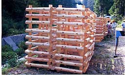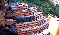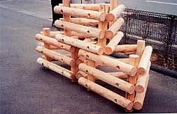 | 4 概 要 | 丸棒加工した製品で、設置場所、使用目的に応じた形への対応が可能な土木資材。組立はボルト締めであり高齢者でも簡単に組立可能。 H13年度国土交通省中部地方整備局が実施した公共工事民間技術活用促進の公募において、間伐材利用部門で当製品を使用した「土岐川水辺環境整備工事」が選定されるなど公共工事での利用が多いが花壇などへの利用も可能。(H13年度において約270基、H14年度も上半期で約580基を施工) |