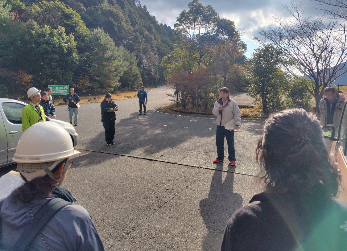 令和7年12月17日(水)、愛媛県農林水産研究所林業研究センターから研修講師の依頼を受け、保育間伐【活用型】請負事業跡地において、間伐と木材生産について説明しました。