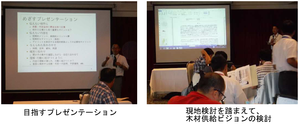 地元首長を対象として想定し、首長に地域の森林・林業の発展のためのビジョンをプレゼンし理解と協力を求めるという設定の演習を行います。