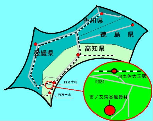 市の又渓谷風景林は、四万十川の左岸に位置する国有林で、四万十市と四万十町(旧大正町)の行政界をなす稜線を含む山岳地帯からなり、標高は450メートルから780メートルに及んでいる。