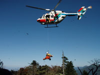 負傷者救助の様子ほかの登山者が救助の邪魔にならないよう補助作業を行います。 |