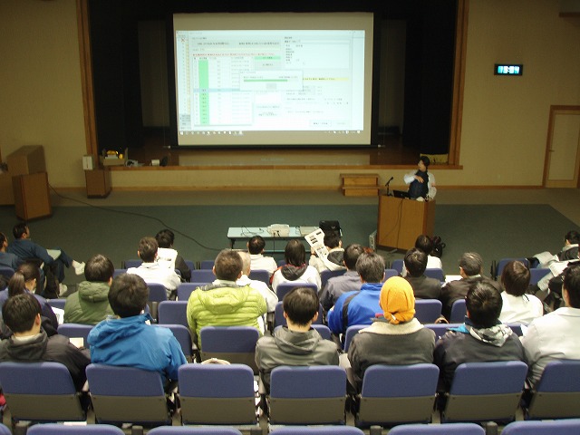 - 午後からは、香北町内の保健福祉センター香北の大ホールへ移動し、収集したレーザー光線による点群データを立体的な3次元画像に再現し、森林の樹高、胸高直径、曲がり、材積等の計測のデモンストレーションを行いました。林内の立木の様子が立体的に映し出された画像に参加者も圧倒されている様子で、ひととおりの説明が終わったあとでの質疑応答では、細かいデータの表示方法に関する内容や、一昨年度に香美市の広範囲で発生した風倒木被害への応用の可否などについての質問が出されました。検討会終了後のアンケート結果では、「レーザー点群画像は立木を実際に見ているようですごいと感じた」、「実際の活用事例をもっと知りたい」、「事業体向けの研修会を行って欲しい」といった意見が寄せられ、関係者の関心の高さが伺えました。