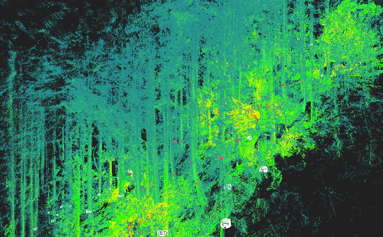 - 地上型レーザースキャナ(商品名「OWL」)とは、森林3次元計測システムのことで、赤外線レーザー光線を使って、林内を簡便に計測し、多くの情報を得ることができます。この機器を活用することにより、1haの林地を一人で一日程度で計測することが可能となり、森林の樹高、胸高直径、曲がり、材積など従来の手計測に比べ大幅な時間短縮が図られ、計測者の個人差なしにデータが得られるなど森林資源調査の効率化や森林管理コストの削減が期待されています。