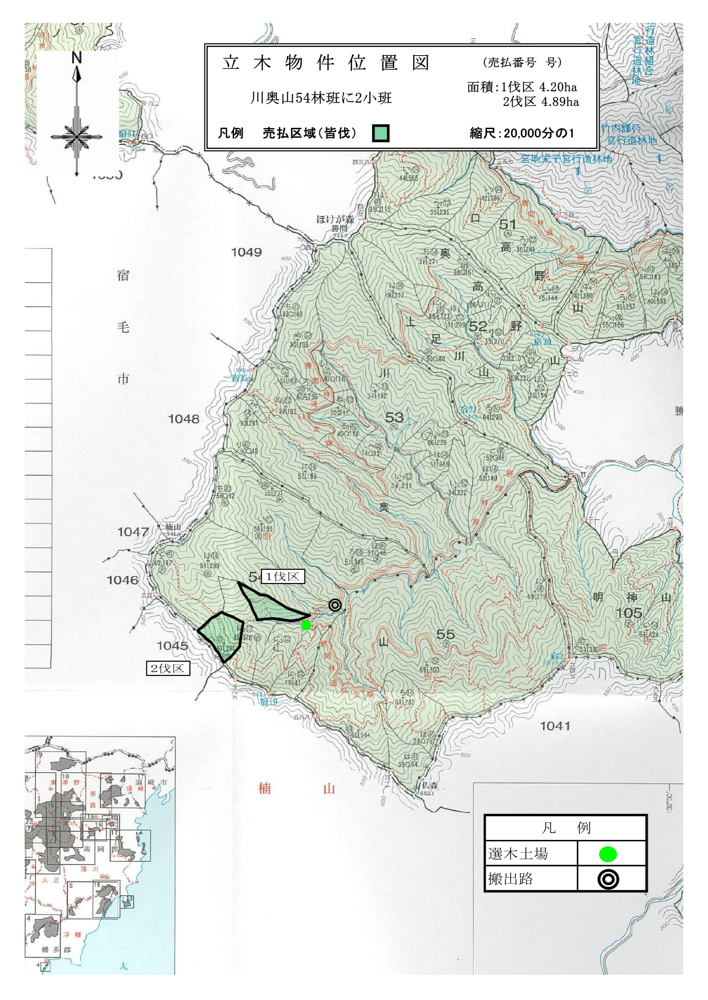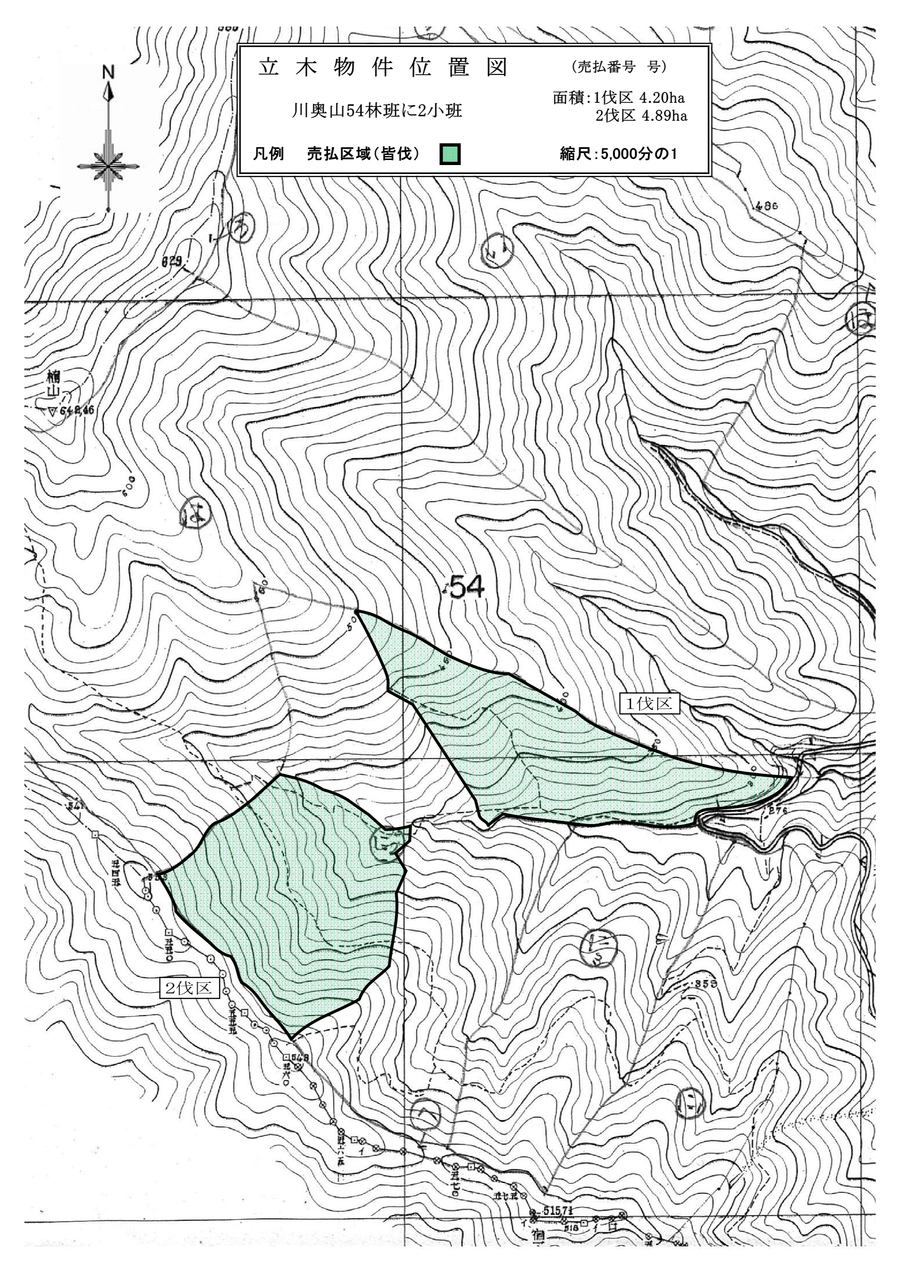 | 2.物件所在地及び国有林名等 | 高知県四万十市勝間 川奥山54林班に2小班(2伐区)(国造) |