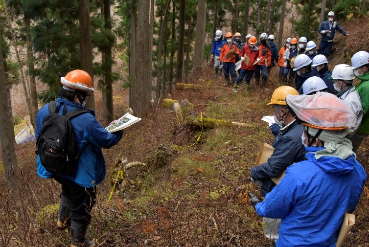 そのような中、過去に作設された作業路網を改めて検証し、いかに再利用が可能か検討するため、11月19日(金曜日)、徳島県三好市東祖谷落合深渕山国有林80林班において、「令和3年度 森林作業道再利用現地検討会」を、徳島県、三好市、三好地区の林業事業体、四国森林管理局・徳島森林管理署から26名の参加により開催しました。