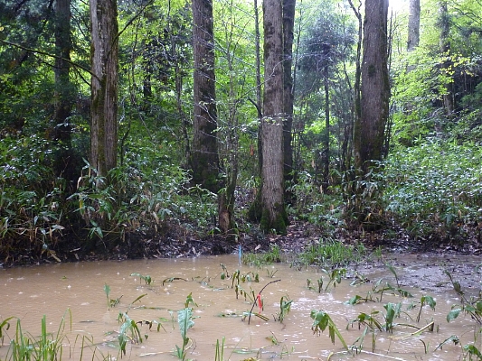 本保護林には、カツラ天然林が純林で自生しており、県内ではこのようにまとまった純林は、非常に珍しく貴重である。 |