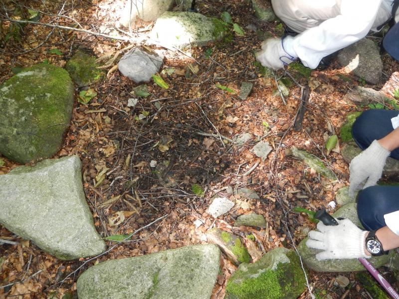 二股には以前からテントを張る場所に利用されているところがあり、以前その場所でたき火の跡が見つかりました。 もちろん生態系保護地域でのたき火は禁止されています。 今年は使用された形跡はありませんでした。 |