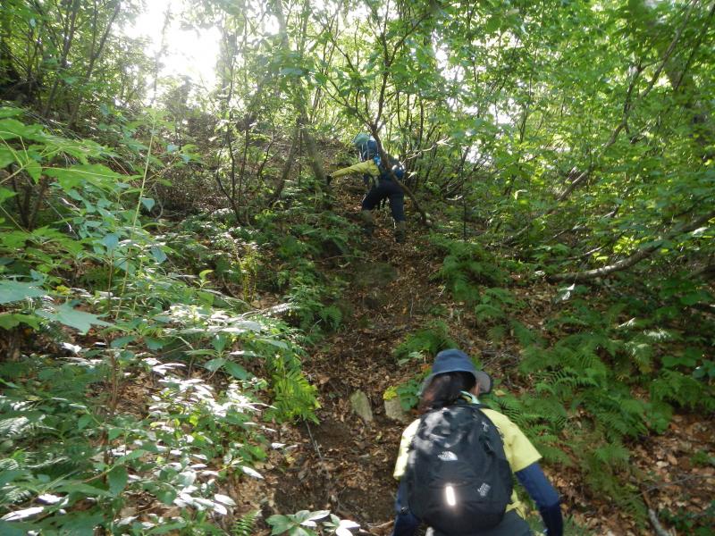 ルート22からルート24に入ります。 入ってまもなく急な登りとなります、この辺で先頭の方々は木からツキノワグマが降りてくるのを見たそうです。 木から降りたツキノワグマは気配を消し、どこに行ったかわからなくなったそうです。 |